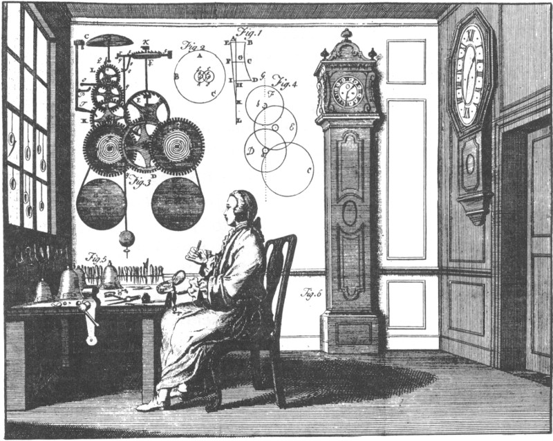 The shop of a London clock and watchmaker. The large octangular faced clock hanging on the wall is typical of the kind that would have been found in public places. It was later called the Parliament clock. One may be seen at the Golden Ball. UNIVERSAL MAGAZINE.