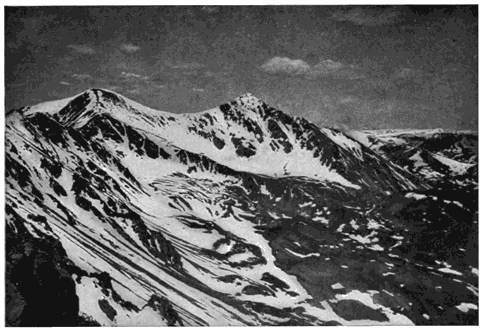 The point of view is on Trinchera Creek looking north from an altitude of about 8000 feet. To the left is the San Luis Valley through which flows the Rio Grande, and to the right are the two high passes known as Veta and Sangre de Cristo. The Sierra Blanca forms the southern end of the Sangre de Cristo Range and was one of the great landmarks of the Wilderness.