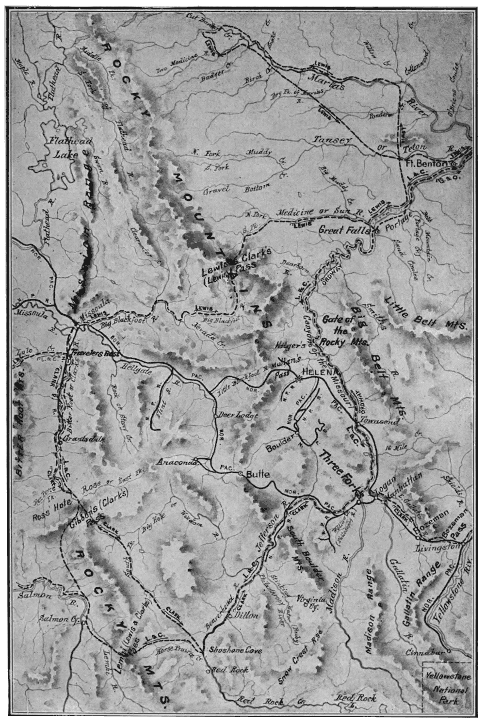 I have had much kind assistance and am grateful for it. I am particularly obliged to Mr. William J. Schieffelin for the generous and unlimited use of valuable books from his library; to Mr. E. H. Harriman for transportation favours; also for the same to Mr. S. K. Hooper; to Mr. F. M. Bishop for the loan of a volume on Jacob Hamblin not otherwise obtainable; to Mr. O. D. Wheeler and the Montana Historical Society for cuts; to Captain E. L. Berthoud, Edgar A. Rider, and Jack Sumner for manuscript notes; to Mr. L. H. Johnson for manuscript notes and photographs; to Mr. B. L. Young for a special drawing of the rock pecking of a buffalo in southern Utah; to Mr. R. H. Chapman, Mr. J. B. Lippincott, Mr. J. K. Hillers, Mr. E. E. Howell, Mr. Delancy Gill, for photographs; and to the United States Bureau of Ethnology for the use of illustration material. I would also here thank my publishers for their constant consideration, for presents of books pertaining to my subject, and for the loan of others; and Mr. H. C. Rizer, chief clerk of the United States Geological Survey, for assistance and courtesies extending over a long series of years. Finally I wish to express my renewed thanks for many favours to the veteran geographer and explorer, A. H. Thompson, of the United States Geological Survey, to whom I have the honour of dedicating this book.