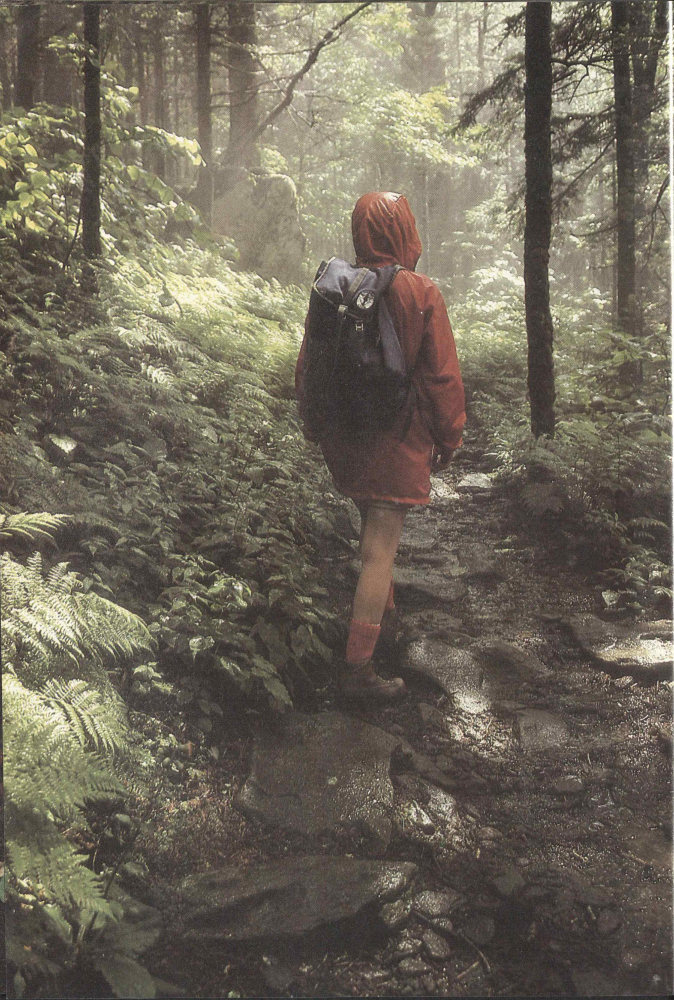 First things first! A rain-geared backpacker makes sure her feet are protected against blisters. The park offers more than 1,300 kilometers (800 miles) of trails, including 110 kilometers (70 miles) of the Appalachian Trail that stretches from Maine to Georgia.