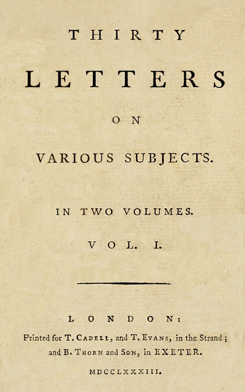 The Project Gutenberg EBook of Thirty Letters on Various Subjects, Vol. I (of 2), by William Jackson This eBook is for the use of anyone anywhere in the United States and most other parts of the world at no cost and with almost no restrictions whatsoever. You may copy it, give it away or re-use it under the terms of the Project Gutenberg License included with this eBook or online at www.gutenberg.org. If you are not located in the United States, you'll have to check the laws of the country where you are located before using this ebook. Title: Thirty Letters on Various Subjects, Vol. I (of 2) Author: William Jackson Release Date: June 9, 2019 [EBook #59710] Language: English Character set encoding: UTF-8 *** START OF THIS PROJECT GUTENBERG EBOOK THIRTY LETTERS, VOL 1 *** Produced by Sonya Schermann, Robert Tonsing, and the Online Distributed Proofreading Team at http://www.pgdp.net (This file was produced from images generously made available by The Internet Archive)