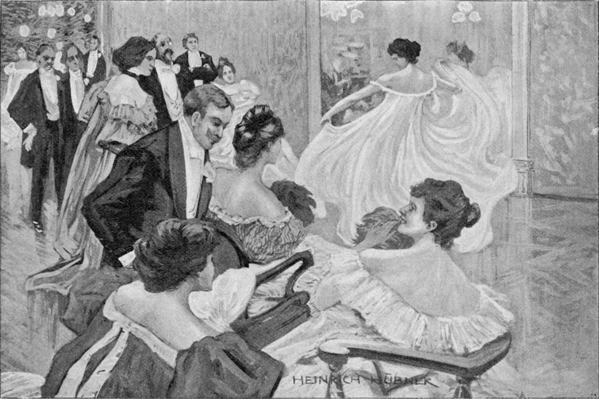 In den mit anspruchsloser Vornehmheit eingerichteten Räumen befanden sich eine Unmenge Herren im Frack und weißer Binde; tiefernst lasen sie Zeitungen, kritzelten mit affenartiger Geschwindigkeit ihre Briefe oder saßen um die Tische der Spielzimmer. In den Fluren und an der Treppe streckten sich zahllose Jünglinge auf den dunkeln ledernen Divanen und schwatzten und kicherten mit gedämpfter Stimme.[S. 8] Hier und da trank einer ein Täßchen Kaffee, einen Cognac oder Selterswasser, die Meisten, wie auch wir, nahmen nichts. Zum Rauchen gab es getrennte Zimmer, die übrigen Räume waren musterhaft gelüftet. „Ja,“ meinte Hoyen auf meine Bemerkung, „die Engländer vergöttern die Aristokratie, sind aber keineswegs exclusiv und nehmen leicht einen Gentleman, was auch sein Vater gewesen, in ihre Kreise hinüber. Zum Gentleman aber gehört, daß man eine vornehme Schule besucht hat, Abends zum Mittagessen sich in einen Frack wirft, peinlich die Wahrheit spricht, ohne tägliche Bäder umkommt und stickige, verbrauchte Luft wie den Tod verabscheut. Also ein bißchen Nietzschianerthum.“ Hier trafen wir auch mehrere Hoyen’sche Bekannte, welche ebenfalls gesonnen waren, den Levinsohn’schen Ball mit ihrer Gegenwart zu beehren. Augenscheinlich verkehrt ganz London bei diesem ursprünglich deutsch-semitischen Bankiers, auch die königliche Familie, was der nur für solche Gelegenheiten bestimmte, auf die Straße gelegte scharlachrothe Teppichläufer schon von Weitem bekundet. Doch bekam ich weder den Prinzen von Wales noch die Wirthe zu sehen. Um uns drängte sich eine dicht gekeilte Menge, es stauten sich die tadellos angezogenen jungen Herren und die Damen in ihrer blitzenden Diamantenpracht und den schneeweißen Schultern. Im Stimmengeschwirr hörte man von der auf zwölfhundert Pfund geschätzten Blumendecoration[S. 11] schwärmen, Andere jammerten über die „Ananastreibhaushitze“ und Andere wieder erzählten von den fünf berühmtesten Schönheiten Londons, welche die Festlichkeit krönten. Aber unser erneuter, mannhafter Versuch, die mit verschwenderischer Rosenfülle umkränzte Treppe hinauf zu gelangen, schlug fehl, auch das Eßzimmer war undurchdringlich dicht belagert, und so standen wir nach einer halben Stunde wieder auf der Straße. Einige Häuser weiter gab es ebenfalls vorfahrende Wagen, Treppenläufer und dichte Scharen wartender Diener. Einen derselben frug Hoyen nach dem Namen der gesellschaftgebenden Herrschaft, erinnerte sich dunkel, mit einer der Töchter ’mal getanzt zu haben, vermuthete zu diesem Abend eingeladen zu sein, ging mit mir hinein und dann aus der Garderobe schnurstracks in das Eßzimmer. Dort traf er mehrere Bekannte, zu denen wir uns an einen der kleinen Tische setzten und höchst gemüthlich abendbroteten. Darauf machte sich Hoyen noch etwas liebenswürdig und geleitete alte Damen an ihre Wagen; schließlich holten wir unsere Sachen und verließen, ohne unsere Gastgeber auch nur erblickt zu haben, das Haus. Als aber mein Willy hierauf noch einen Stoß Einladungskarten herausholte und mir kaltblütig noch weitere Gesellschaften vorschlug, krümmte sich denn doch selbst der Wurm, und störrisch verlangte ich nach Hause zu gehen.