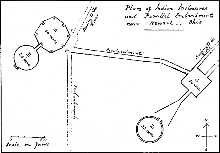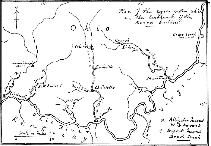 | Mounds and Earthworks in Ohio.—Ancient Fortified Inclosures at Circleville.—Discoveries in a Burial Mound.—Alligator Totem near Newark.—Fort Ancient.—Age of Trees growing upon the Ramparts at Fort Hill.—Traditions.—Geometrical Ground Plans of Indian Inclosures.—Conclusions | 79 |