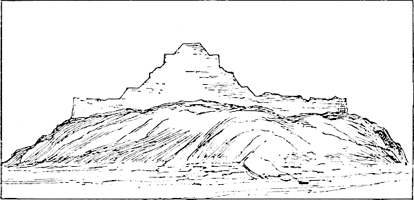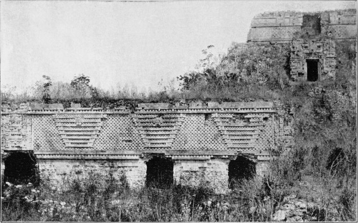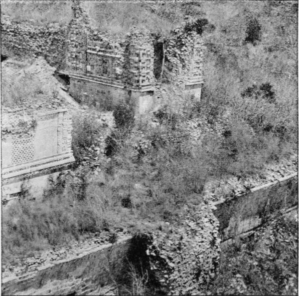 I wish to call particular attention to the representation of that part of the Casa de las Monjas where the adjacent Temple of the Dwarf is seen. In comparing the structures with the pyramid, it has to be remembered that the Casa de las Monjas is placed upon a raised platform not less than seventeen feet in height. The Pyramid of the Dwarf is completely detached.