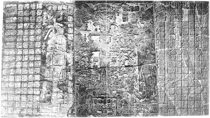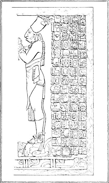 The left slab, upon which is graven the smaller figure, is from a photograph of a moulding made by M. Desiré Charnay. The right slab is from a photograph of the original stone now placed in the museum at Washington, and which was represented in the Memoir upon the Palenque Tablet written by Professor Rau, and published by the Smithsonian Institution. The photographs of the right and left slabs have been reduced to the size of that of the centre, and thus an exact reproduction of the whole of the Tablet of the Cross has been obtained. The representation in the frontispiece is, approximately, upon the scale of one inch to the foot and is therefore a twelfth of the size of the original tablet when it was in its position within the temple.