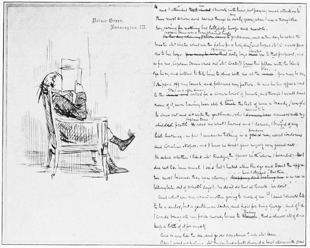 her son Arthur Pendennis,” he wrote to Mrs. Brookfield from Brighton in 1849, “I got up very early again this morning. He is a very good-natured, generous young fellow, and I begin to like him considerably. I wonder if he is interesting to me from selfish reasons, and because I fancy we resemble each other in many parts.” “I wonder what will happen to Pendennis and Fanny Bolton,” he remarked in another letter to the same correspondent; “writing and sending it to you, somehow it seems as if it were true.” Mrs. Ritchie remembers entering her father’s study one morning about two years later and being motioned away, and how, an hour later, he went to the school-room and, half-laughing, half-ashamed, said: “I do not know what James can have thought of me when he came in with the tax-gatherer after you left, and found me blubbering over Helen Pendennis’s death.”