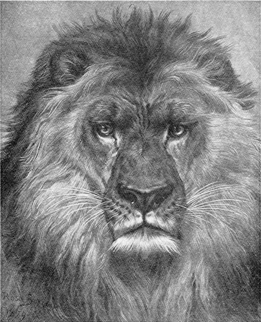 8We read of how the father and his sons made many visits to the Zoölogical Gardens, where they could watch and make sketches of lions, bears, and other wild animals. One day they saw a strange sight in one of the store windows in London—it was a Newfoundland dog caring for a lion. The lion had been caught in Africa when it was very little, and had been cared for by this great Newfoundland dog. They had never been separated, and now, although the lion was much larger than the dog, they were still the best of friends. Sometimes the dog would punish the lion if it did not behave, and the great beast would whimper just as though it could not help itself. All three boys made many sketches of this strange pair, and could hardly be persuaded to leave the window.