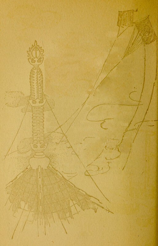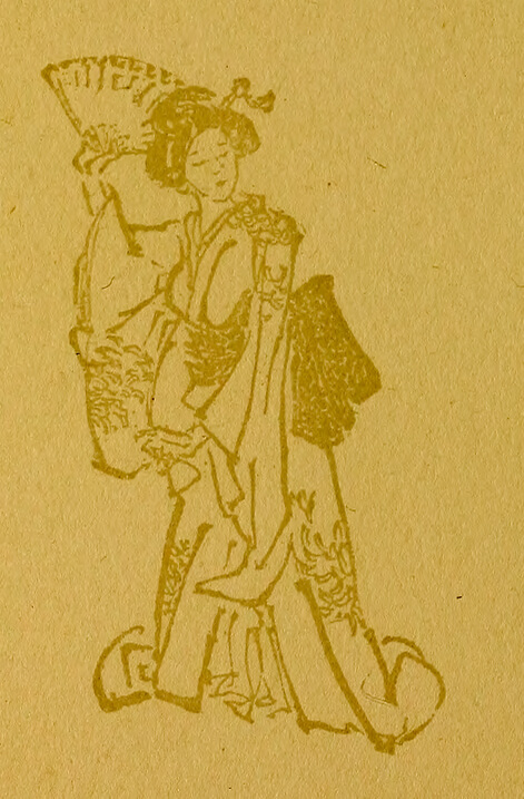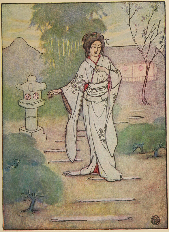 She pirouetted around on the tips of the toes of one little foot, clapped her hands, and courtesied to the four corners of the earth. Her dance was one of the body rather than of the feet, as back and forth she swerved. There was a patter, patter, patter. Her garments seemed endowed with life, and took on a sorrowing appearance; the lights changed to accompany her; the music sobbed and quivered. It had begun to rain! She was raining! It seemed almost as if the pitter-patter of [pg 6] her feet were the falling of tiny raindrops; the sadness of her garments had increased, and now they seemed to be weeping, at first gradually, then faster and still faster, until finally she was a storm—a dark, blowing, lightning storm. From above the light shot down in quick, sharp flashes, the drums clashed madly, the koto wept on, and the samisen shrieked vindictively.