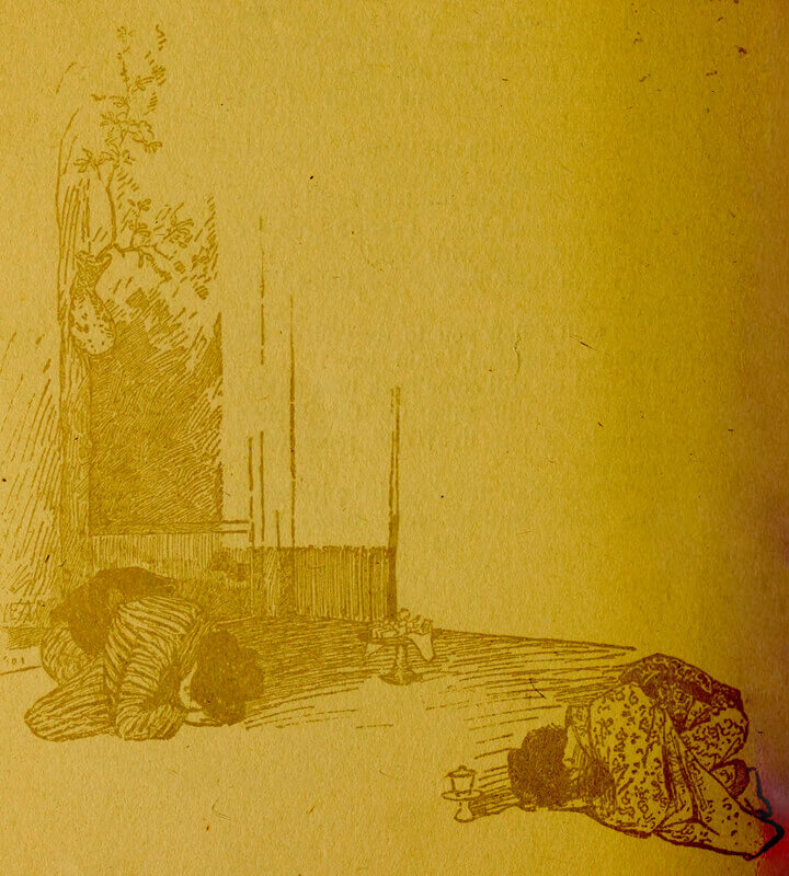 The seekers of pleasure who made [pg 3] their way out to the little island on this night moored their boats here in the shadows beneath the trees, and drove in fairy vehicles, pulled by picturesque runners, clear around the island, under the pine-trees, over miniature brooks, into the mysterious dark of a forest. Suddenly they were in a blaze of swinging, dazzling lights, laughter and music, chatter, the clattering of dishes, the twang of the samisen, the ron-ton-ton of the biwa. They had reached the garden and the tea-house.