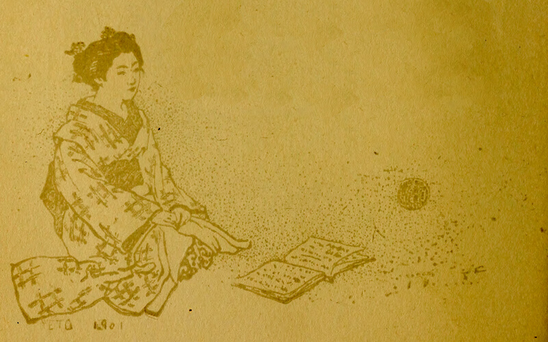 Some pleasure-loving Japanese were giving a banquet in honor of the full moon, and the moon, just over their heads, clothed in glorious raiment, and sitting on a sky-throne of luminous silver, was attending the banquet in person, surrounded by myriad twinkling stars, who played at being her courtiers. Each of the guests had his own little mat, table, and waitress. They sat in a semicircle, and [pg 4] drank the sake hot, in tiny cups that went thirty or more to the pint; or the Kyoto beer that had been ordered for the foreigners who were the chief guests this evening. This is the toast the Japanese made to the moon: May she with us drink a cup of immortality! and then each wished the one nearest him ten thousand years of joy.