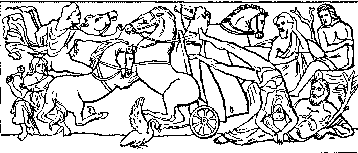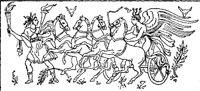 Phaeton saw there the four seasons. Spring, young and lovely, came first, her head crowned with flowers. Next came Summer, with her robe of roses thrown loosely about her and a garland of ripe wheat upon her head. Then came merry Autumn, his feet stained with grape juice; and last, icy Winter, with frosty beard and hair, and Phaeton shivered as he looked at him. Dazzled by the light, and startled to find himself in such a presence, he stood still.